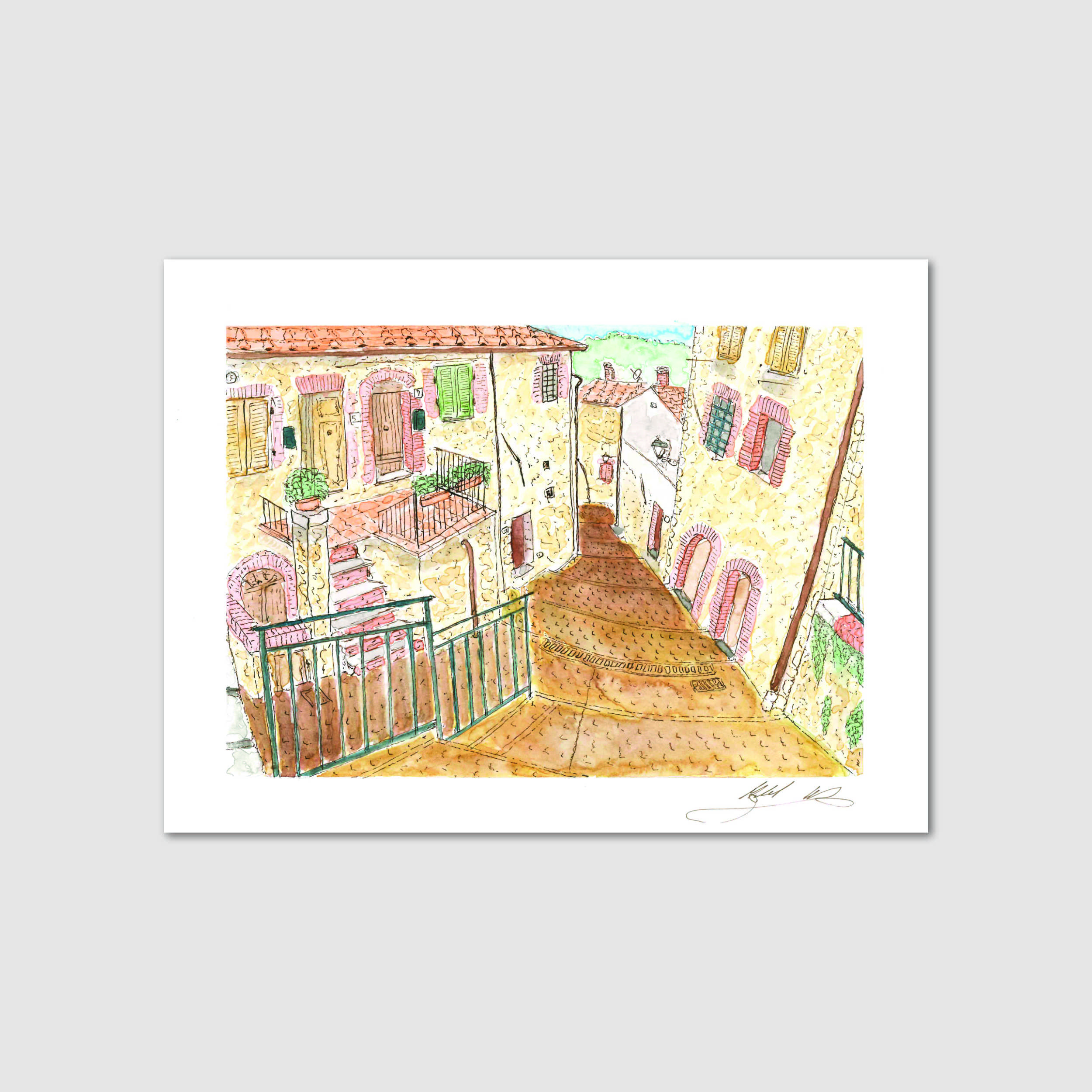 Like most Italian villages, Pari is a community connected by many series of stairs. These stairs lead up from the main parking lot, past La Porta Magnifica, and up to the main giro past the curve featured in Il Ponte - II. I was fascinated by the way the stairs ran down below the little terrazza (patio) on the left-hand side of the stairway. The right side of the stairway is protected by a fence to help prevent unsuspecting visitors from driving off the edge of what appears to be a straight roadway (hint - it has a curve).