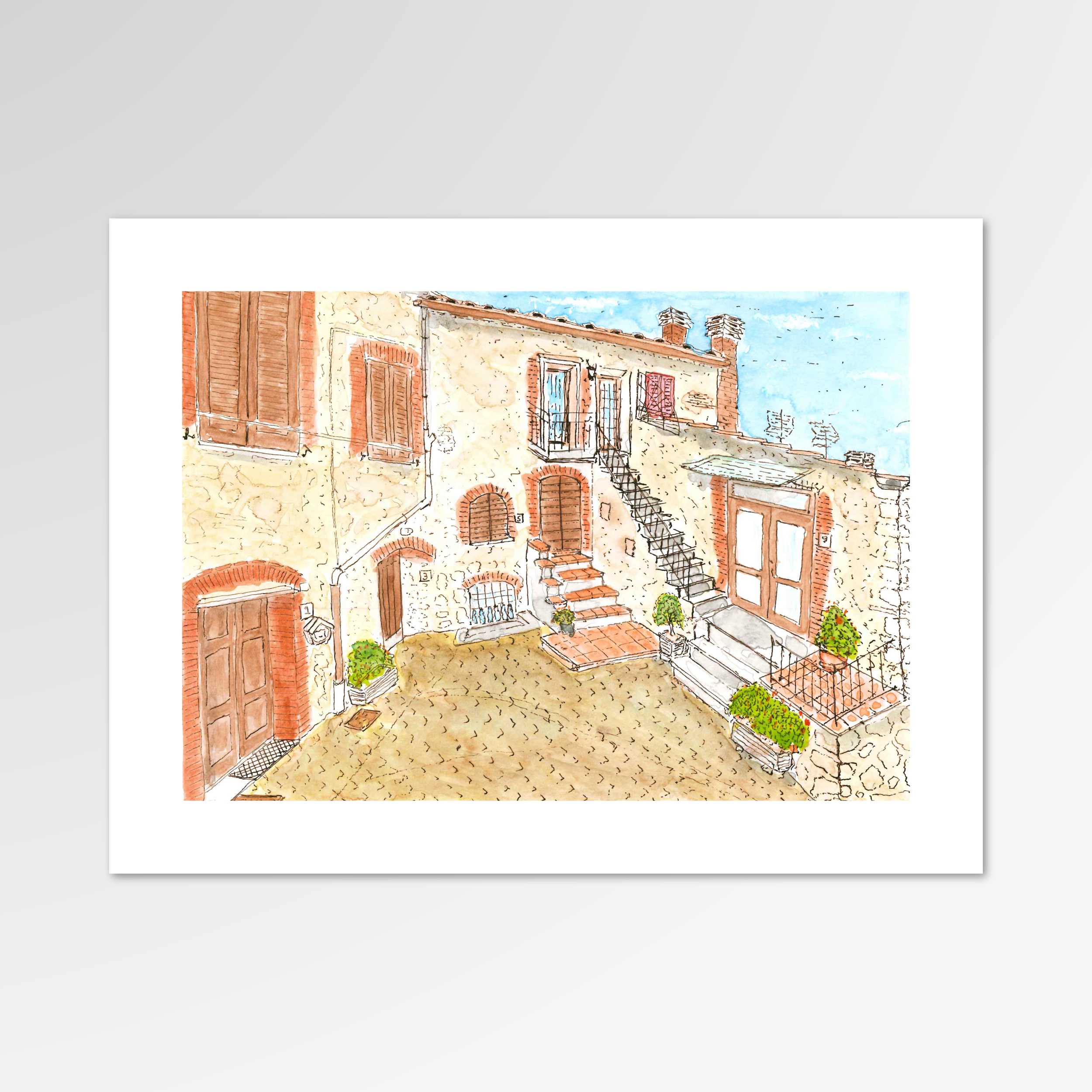 I felt as though this little nook tucked behind Le Due Cecche had so much character that I just had to paint it. This is another example of the unpredictable ways in which walls and buildings intersect with one another in medieval Italian villages. If you look closely, you can see water bottles sitting outside the one window to ward of cats who may want to disturb the ambience (and smell) of the surroundings.