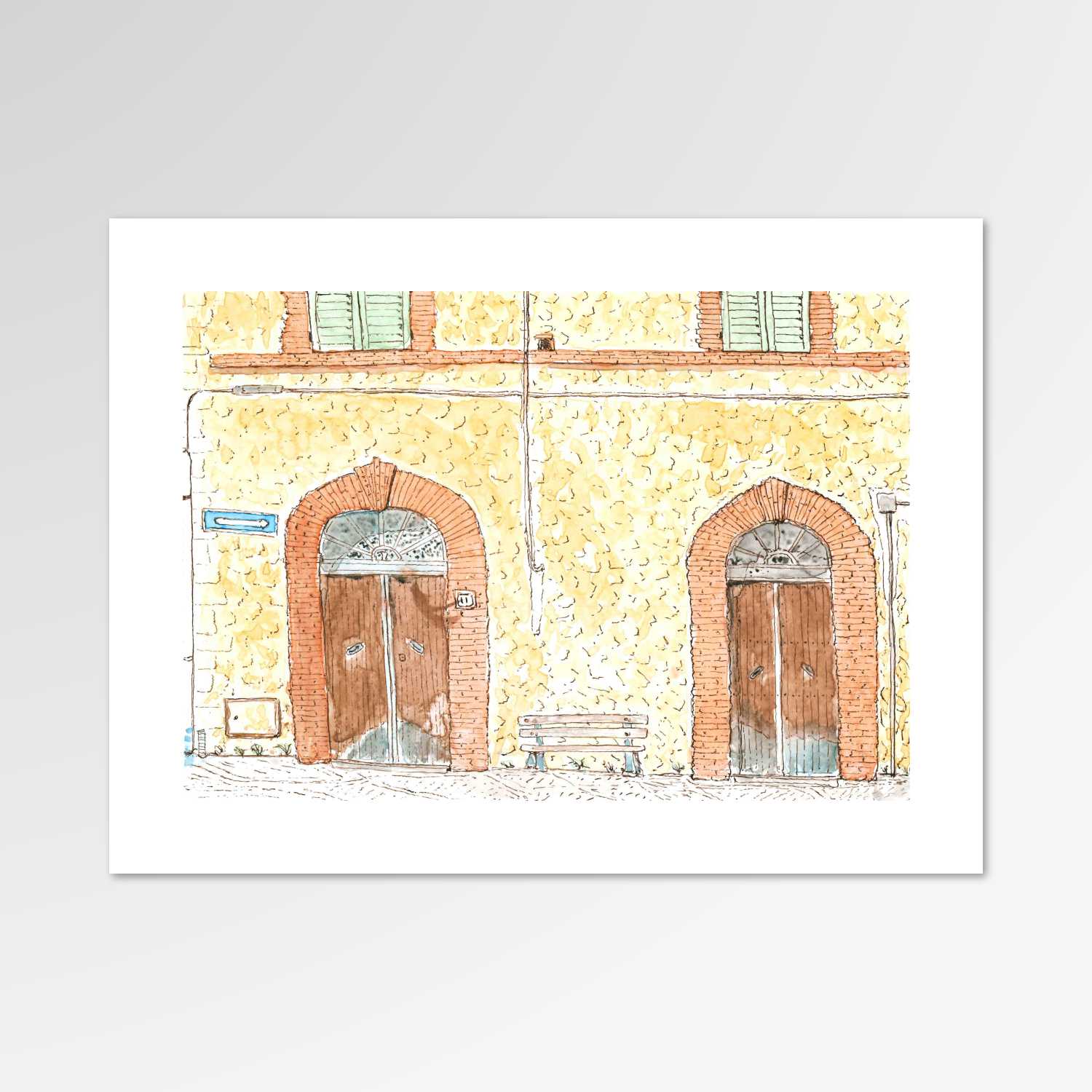 This painting continues the perspective of La Piazza Castelfidardo - I by depicting the scenery across the street from the restaurant, Le Due Cecche. This piece, along with the other, forms a panoramic of the piazza to help frame what it feels like to be in the main common area of the village. This is the area where people meet and children play, sometimes until late in the night. Sound carries in a stone village and even people up in the palazzo will be welcomed by a low hum from the interactions of the villagers below.