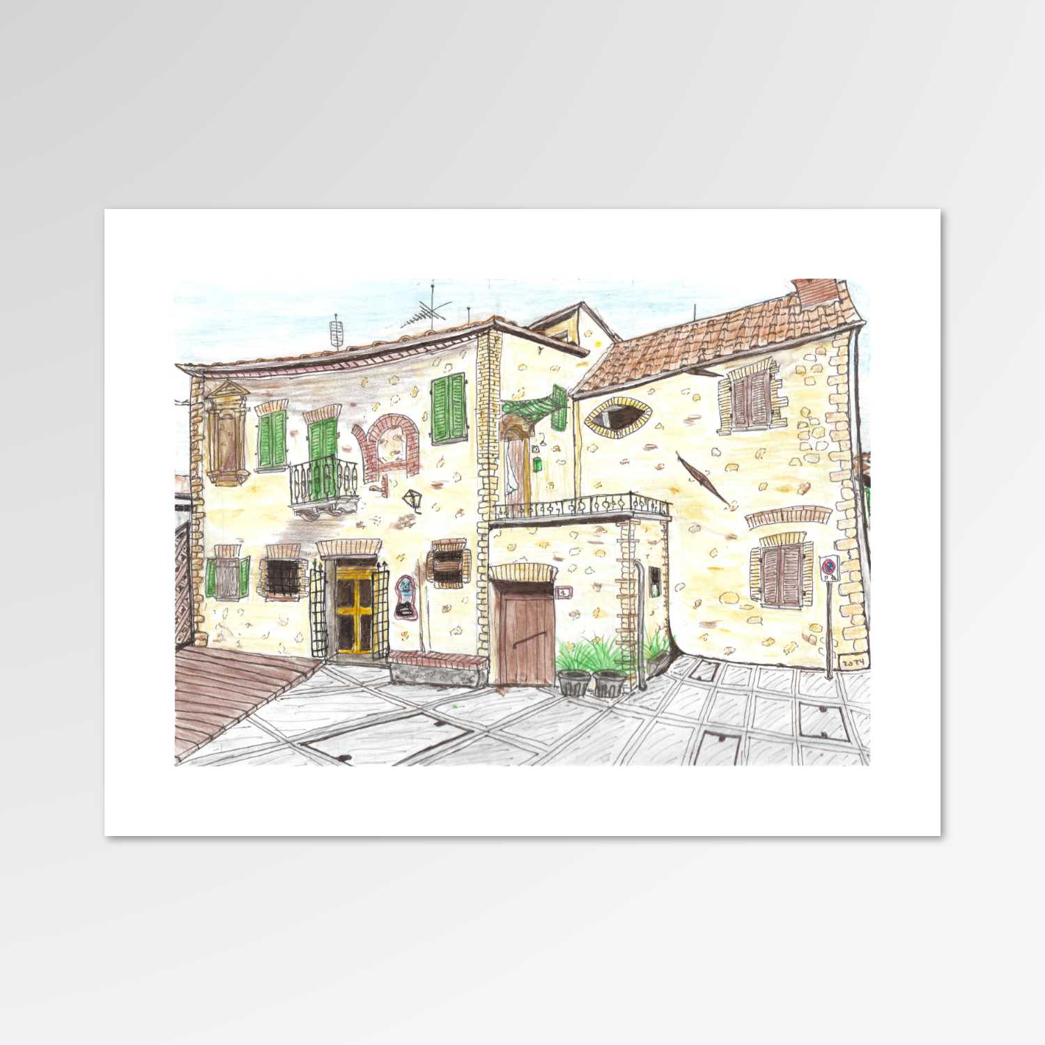 This was my first rendition of the local restaurant in Pari, Italia affectionately named “Le Due Cecche”, which are a type of mockingbird typical to the Tuscan region of Italy. At this point in time, I was still using black Micron pens and watercolor pencils — hence the dark lines and the saturated greens. This illustration depicts the restaurant in the winter months, when the patio and its plants, chairs, and umbrellas have been packed away.