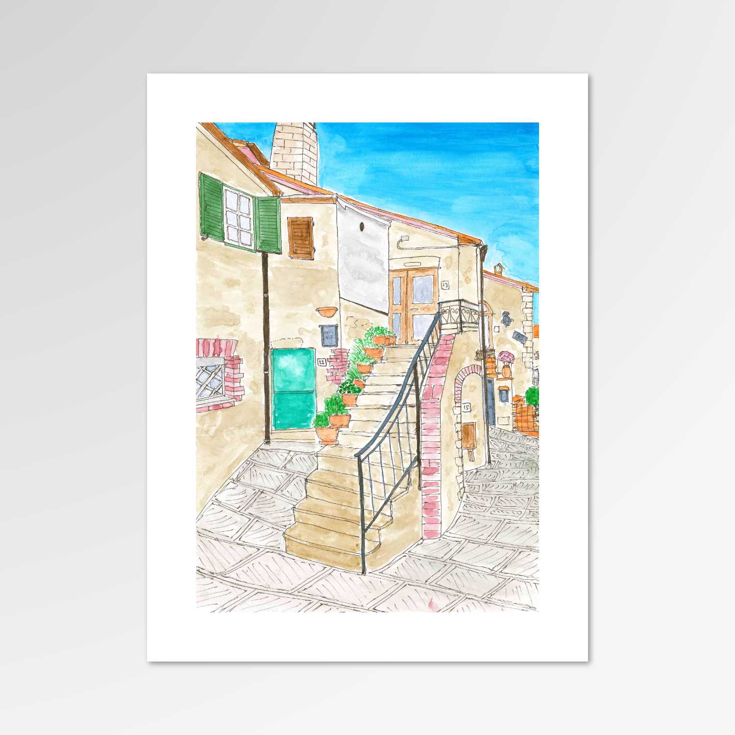 The medieval village of Pari, Italia not only has many nooks and crannies, but an intricate system of staircases as well. These stairs are often populated with potted plants which not only add a splash of color, but a vibrant sense of life as well. I used the Winsor & Newton professional watercolors on this piece as well, as I wanted this painting to have a deep blue sky and a vibrant green door to the side of the stairs. At this point, I was also working out different ways of approaching brick, and painted each one individually with different tones of color.