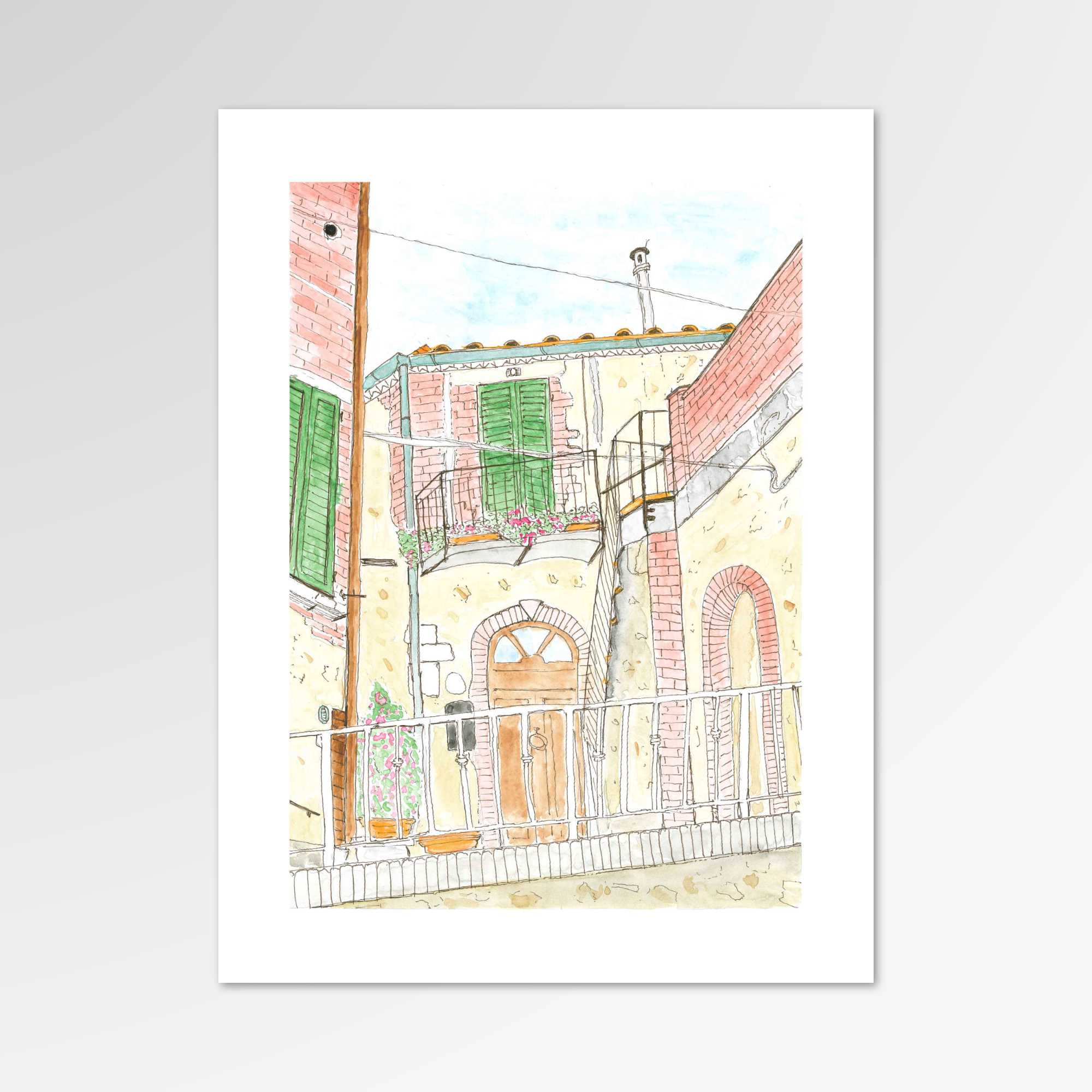 If you look up from the main church in Pari, up towards the palazzo you will see the most interesting intersection of doorways, balconies, plants and shutters. I wanted to capture the beauty that the many-layered architecture creates, by zooming in on a perspective that most people would normally tend to overlook. I remember being quite pleased with how well I was able to mix the colors for this scene, particularly the colors for the brick and stonework.