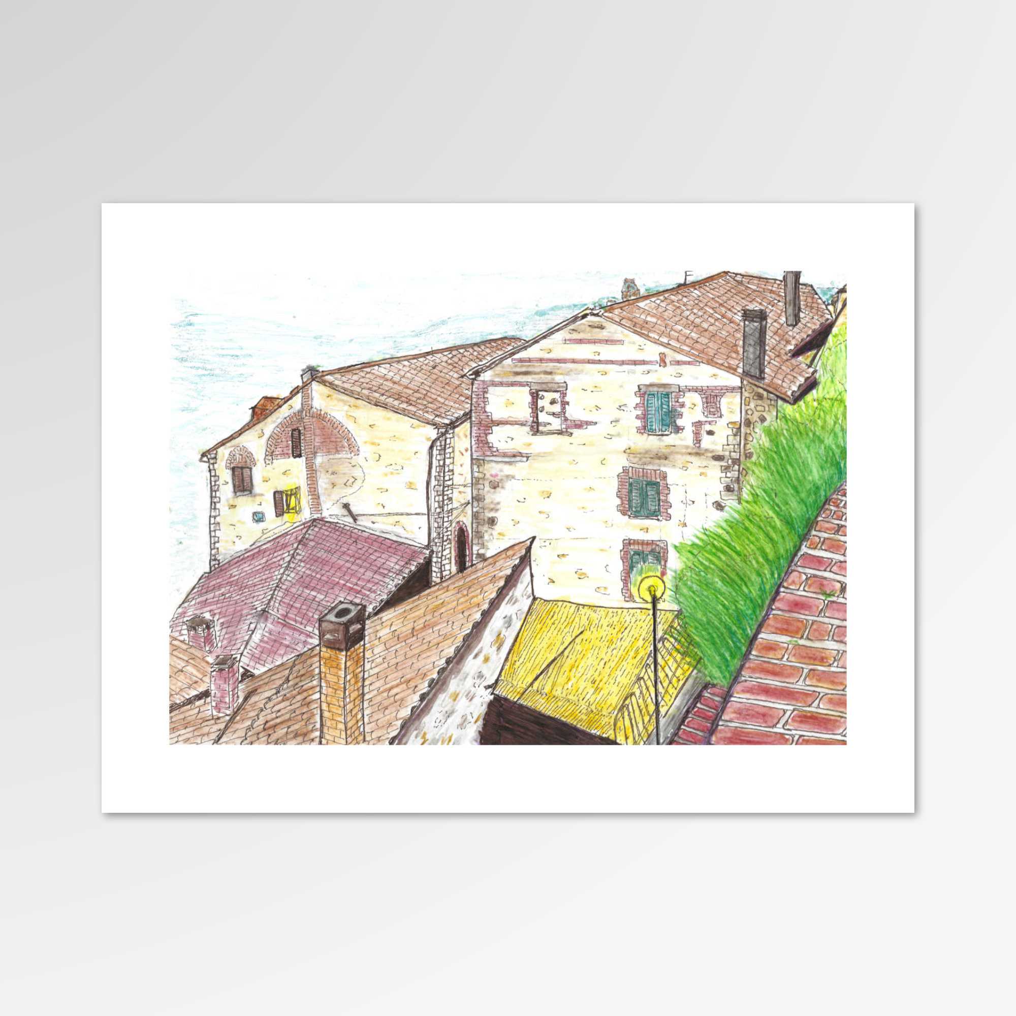 This is the first piece that I created with margins. Although I had used bristol board a few times before, I was hoping that adding the margins would let the picture breathe - and it did! This is a drawing looking out from the front of the palazzo in Pari, Italia. Here you can see how the roofs enfold over top of each other, as well as the details of the brickwork that show old chimneys, windows, and doors so typical of Tuscany.