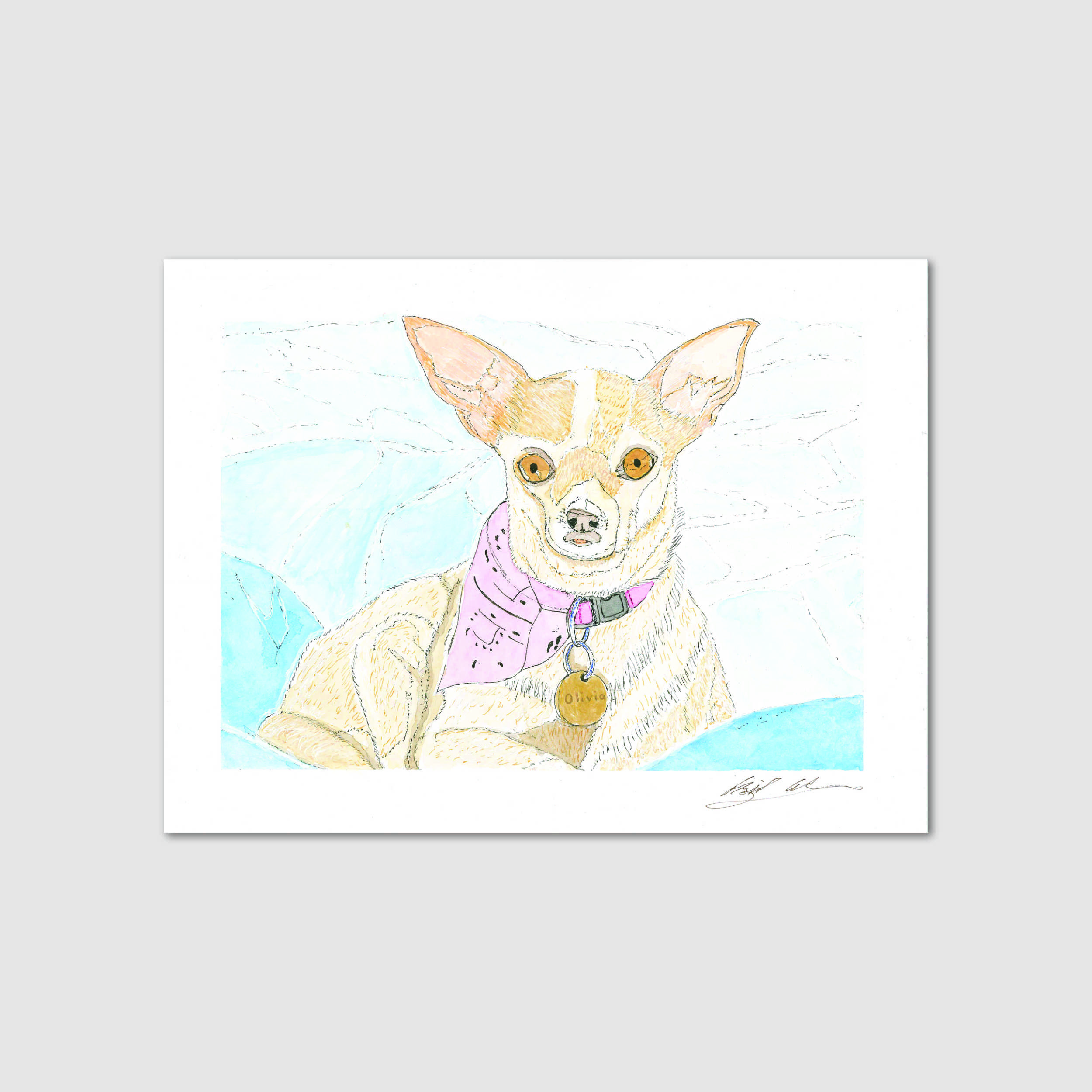 This is the second portrait that I painted of my friend’s daughter’s dog, Olivia. While the first portrait came out well, I had painted the eyes blue instead of brown. As far as I was concerned, I may have well painted the wrong dog. For all of its beauty in capturing the organic, flowing nature of things, watercolor does have its limitations. Unlike oil and acrylic, watercolor can be next to impossible to rework without it becoming muddy, especially in features such as eyes that require transparency. As much as I tried, there was no way to rework Olivia’s eyes to my satisfaction. So, I spent a few days creating another portrait — being sure to paint them brown instead of the reflected blue.