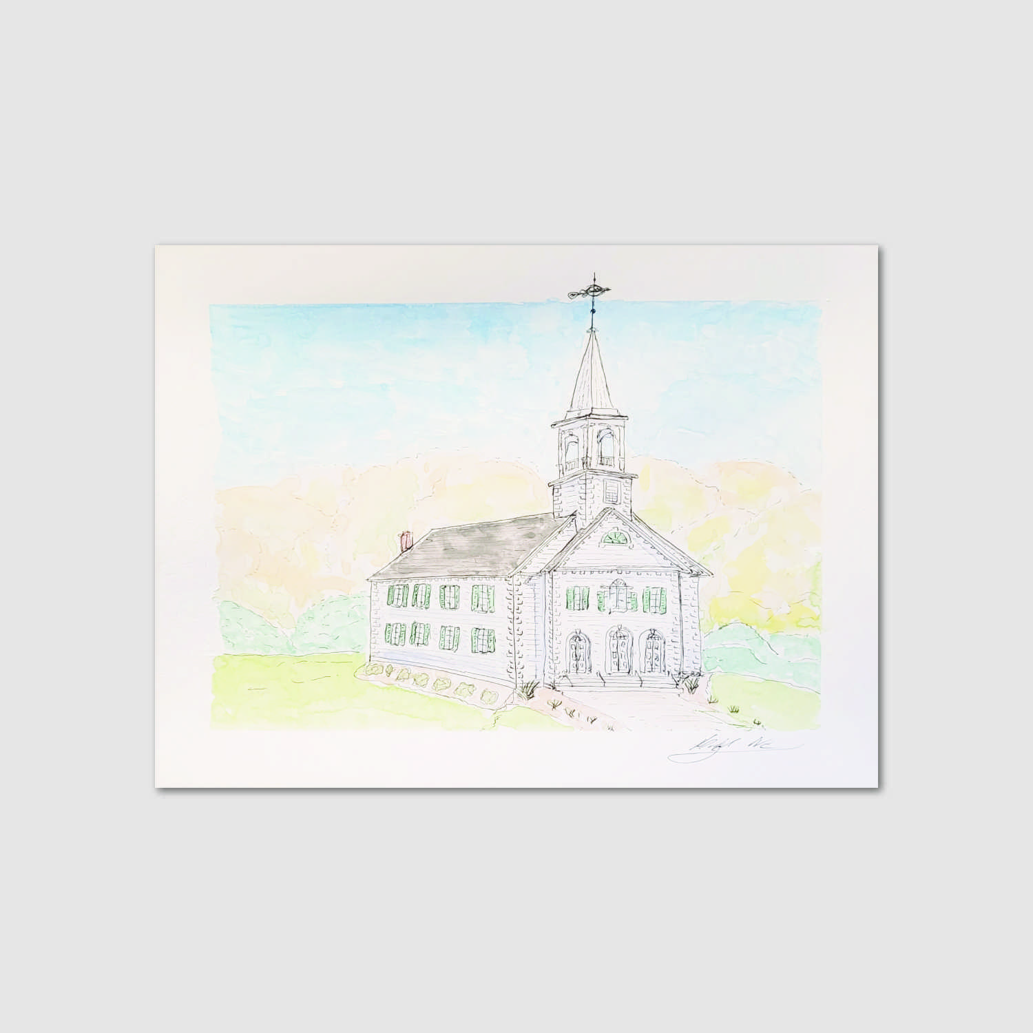 This is a portrait of the old Congregational church in the village where I grew up. At one point in time, this church served as the meeting house and center of town politics. This is a classical New England church, complete with the white clapboards and tall steeple. The picture of this piece isn’t as detailed since my friend, who wanted a commission of this church, snapped it up before I could get it scanned at the graphics center.