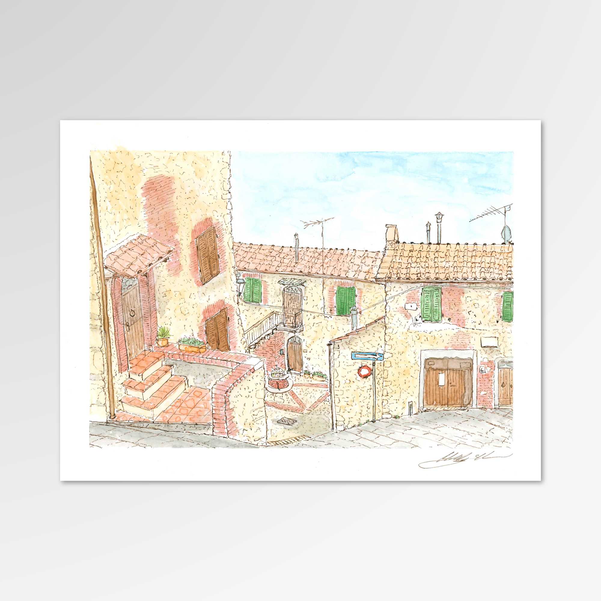 This piece pairs with La Piazza Destra - I to create a panorama of the main piazza in Pari, Italia. I find this piece particularly interesting because it captures the way the layers of streets flow into one another across this hilly landscape. The roads literally pour into one another, allowing you to move from the center of the village down to its edge where it borders on the fields, vineyards, and olive groves.