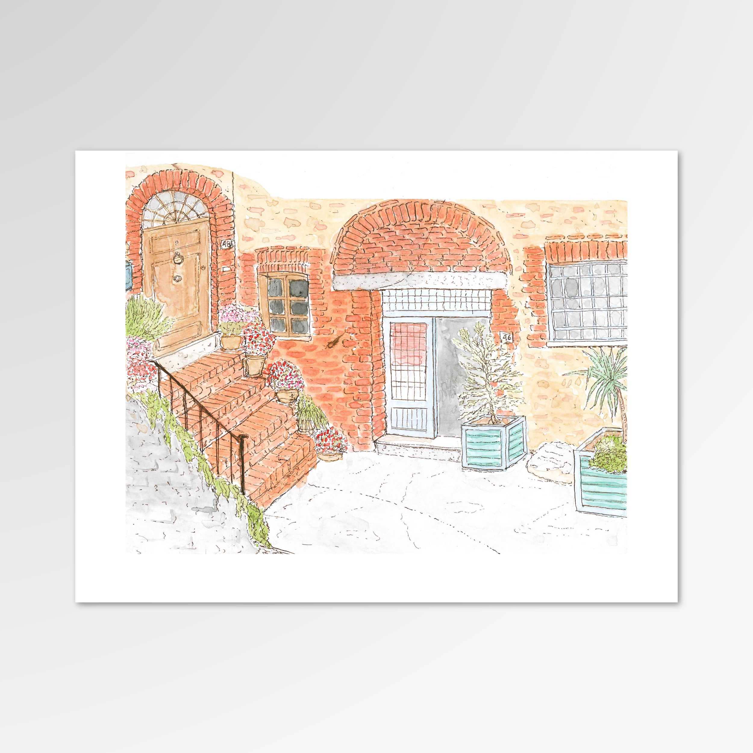 I had been wanting to paint this area of Pari for quite some time, and finally felt as though I could begin to do it justice. To me, this is one of the most beautiful areas in all of Pari, in no small part due to the way the stairway is always filled with flowers. There is something magical about the way the square planters frame the stairwell and shop area as well, balancing out the brickwork with their green-blue hues.