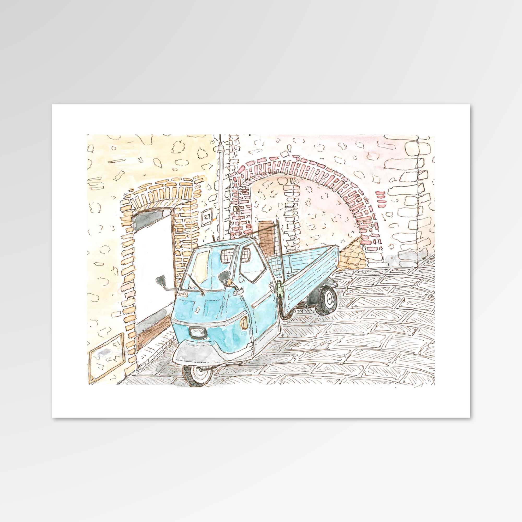 While I Papaveri - I illustrates one end of the path connecting the lower giro to the arches, Il Camion Triciclo - I illustrates the other end of the path. Oftentimes, especially in the evening and afternoon, one may find this little three-wheeled truck tucked into where the arches end. This is such a fun little truck, which has just enough room to fit the man and his dog who use it to run errands in and around the medieval village of Pari.