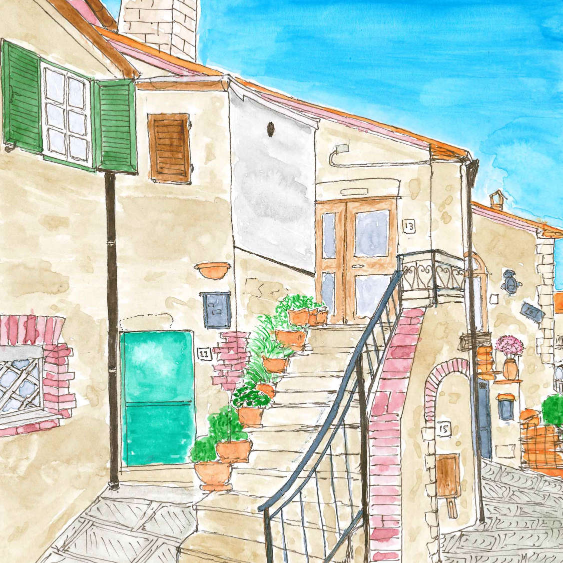 After posting my third piece of art focusing on Le Due Cecche, some of you may be wondering about my fascination with the architecture of this structure within my little medieval village. Like many of the pictures that I paint, however, these pieces go beyond the formal structure and into what they represent on a very human level. For Le Due Cecche is much more than a simple building, or even a restaurant Le Due Cecche represents the social center at the heart of Pari.