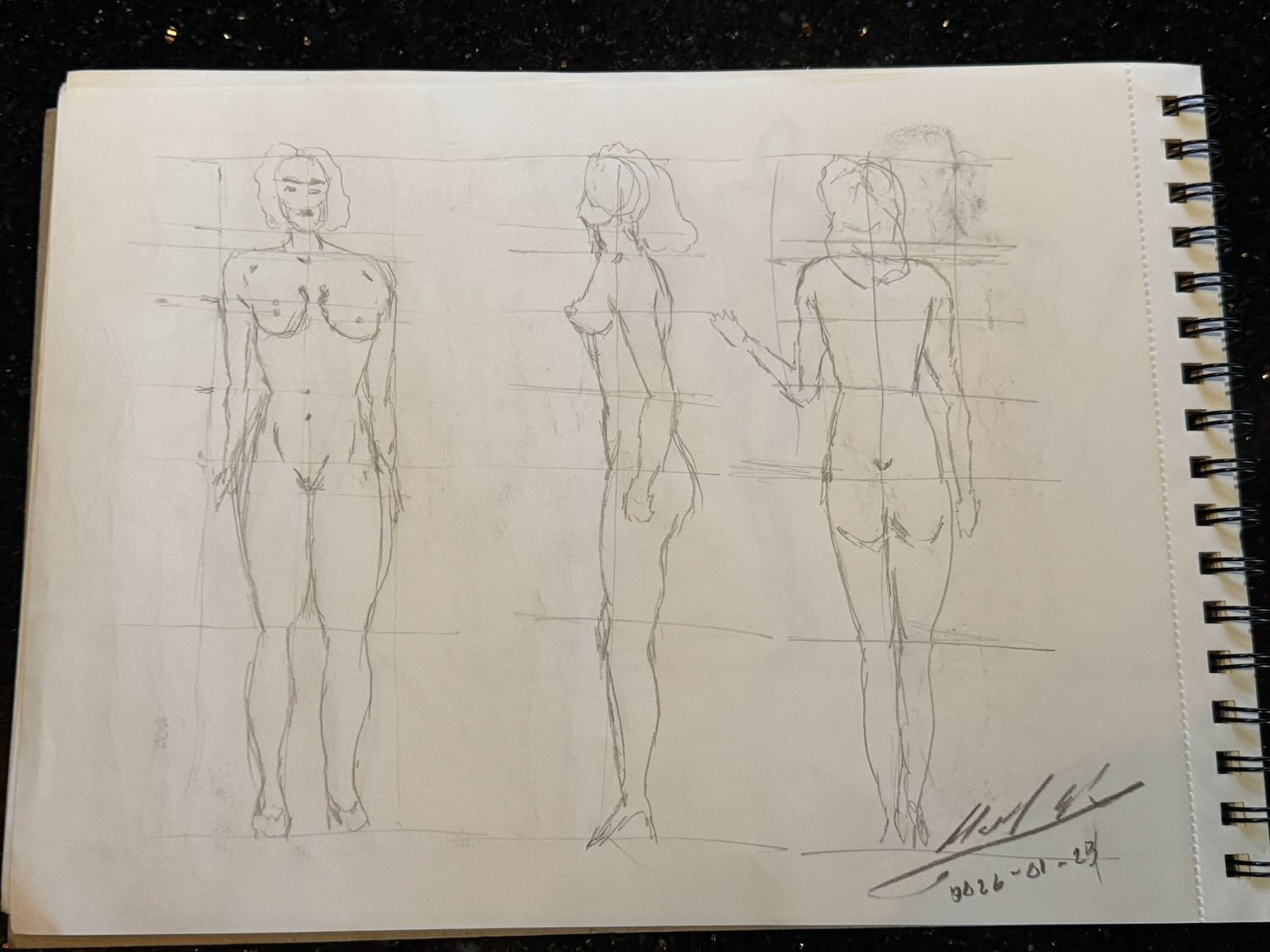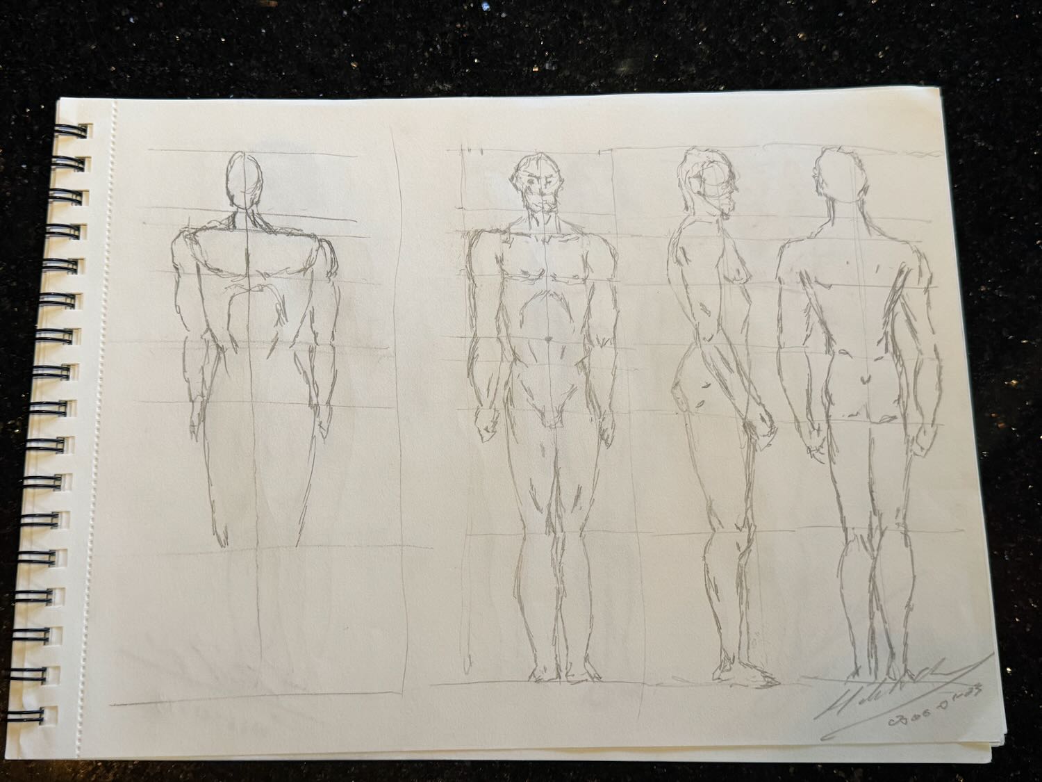 Today, I decided to step out into another realm and work with lines of flesh instead of solely upon proportions using the skeleton of a mannikin-based body. These are the three-view diagrams of men and women, working with and incorporating the lessons of proportion from my previous exercises.