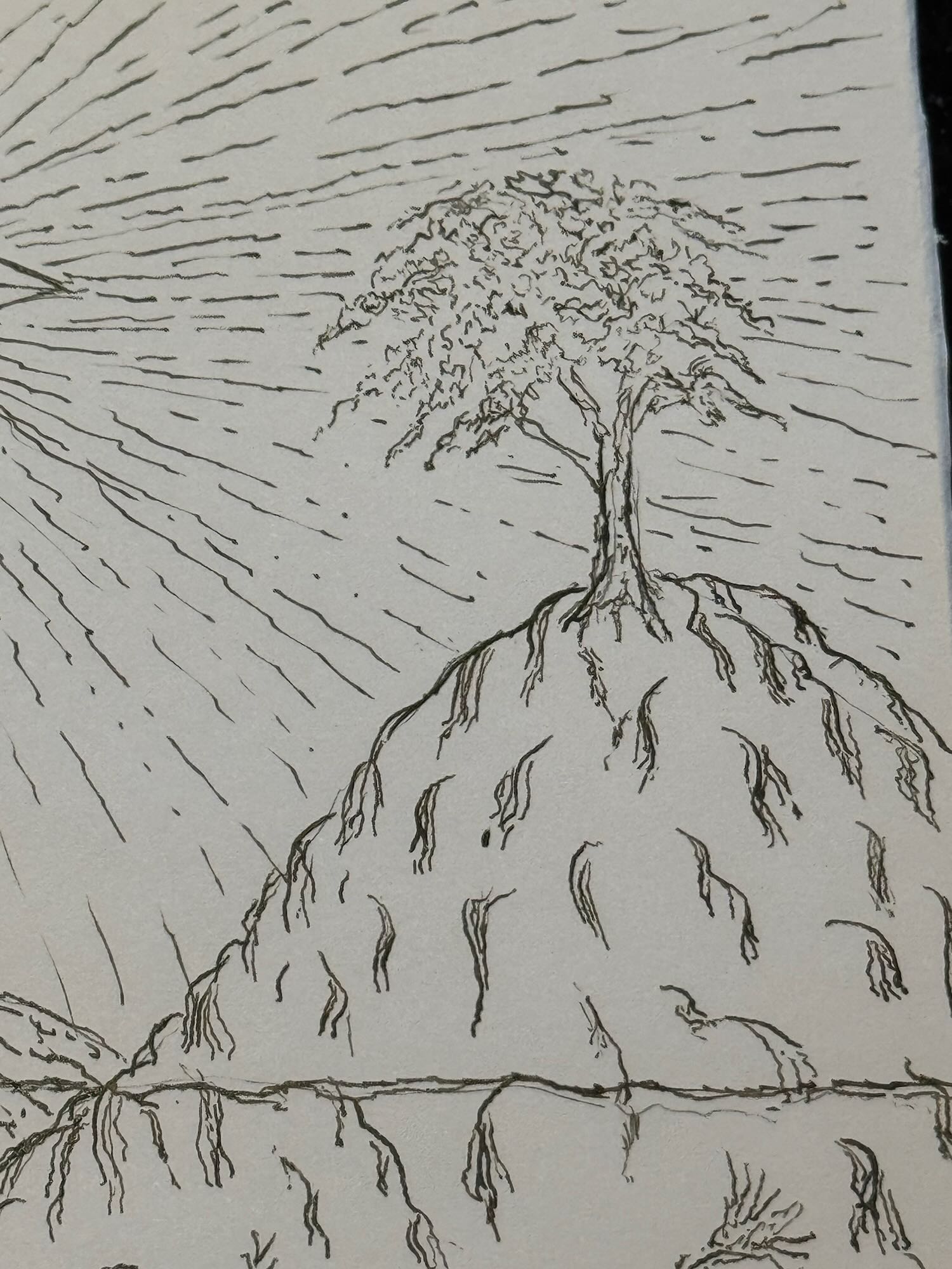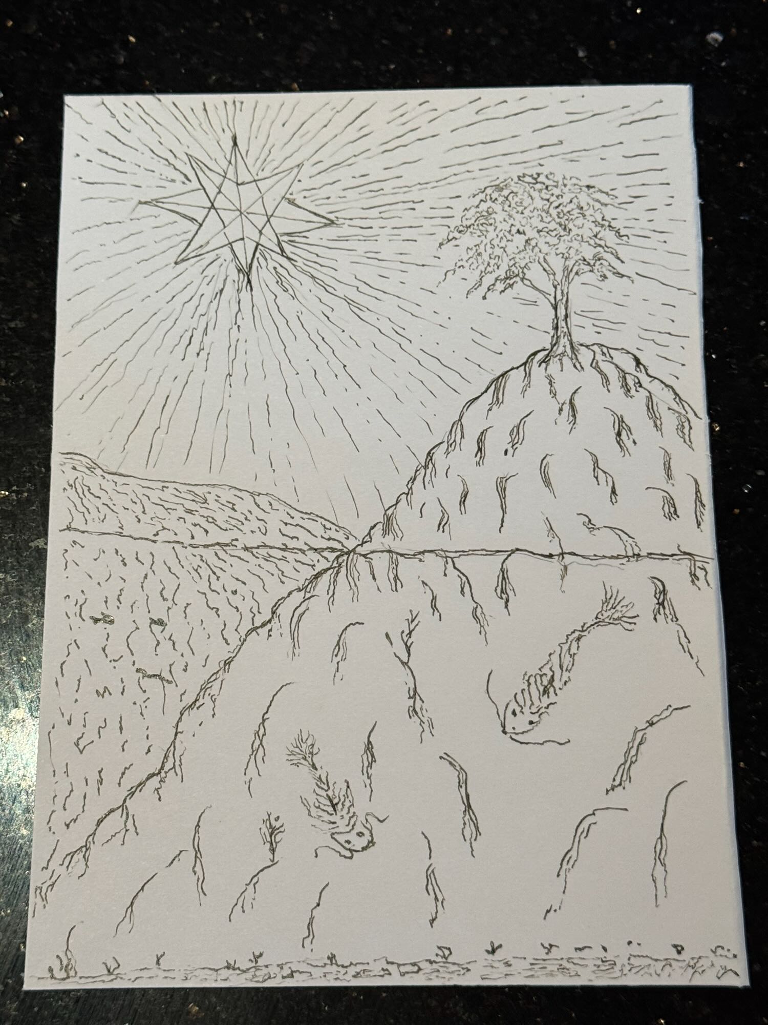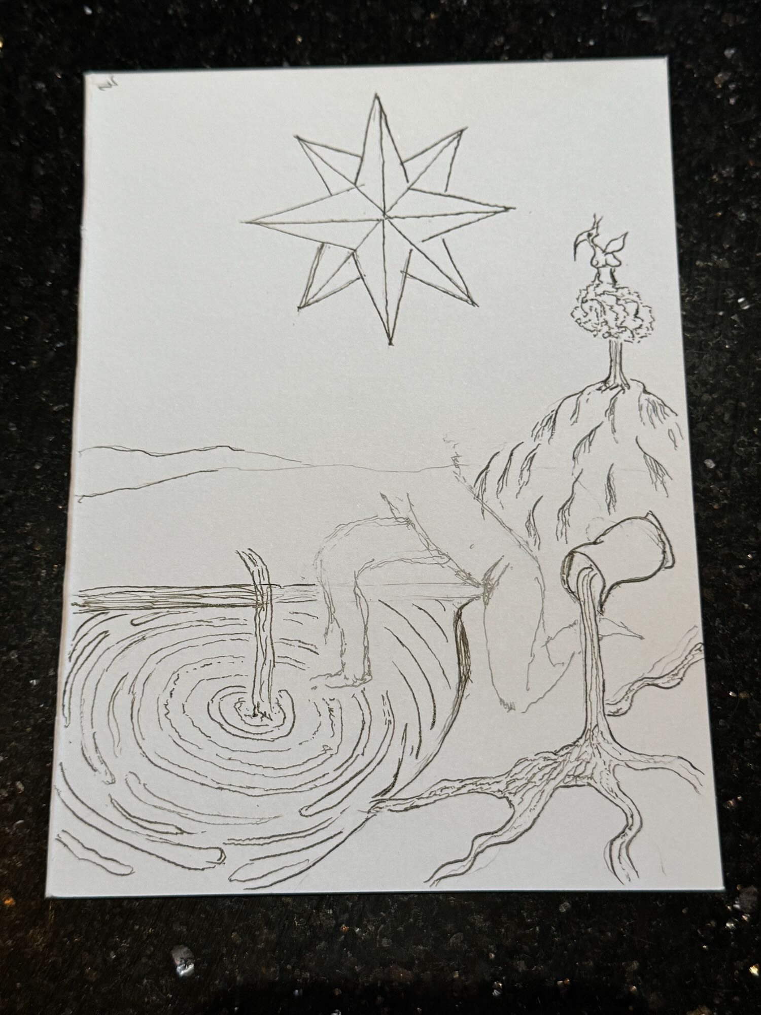 This is an exploration in ink of The Star XVII card within the tarot. I drew inspiration from the Japanese woodblock printing and engraving techniques to explore different ways of creating texture and depth. Here is also where I realized that I needed to work on my figure drawing if I intend to create a tarot deck of my own.