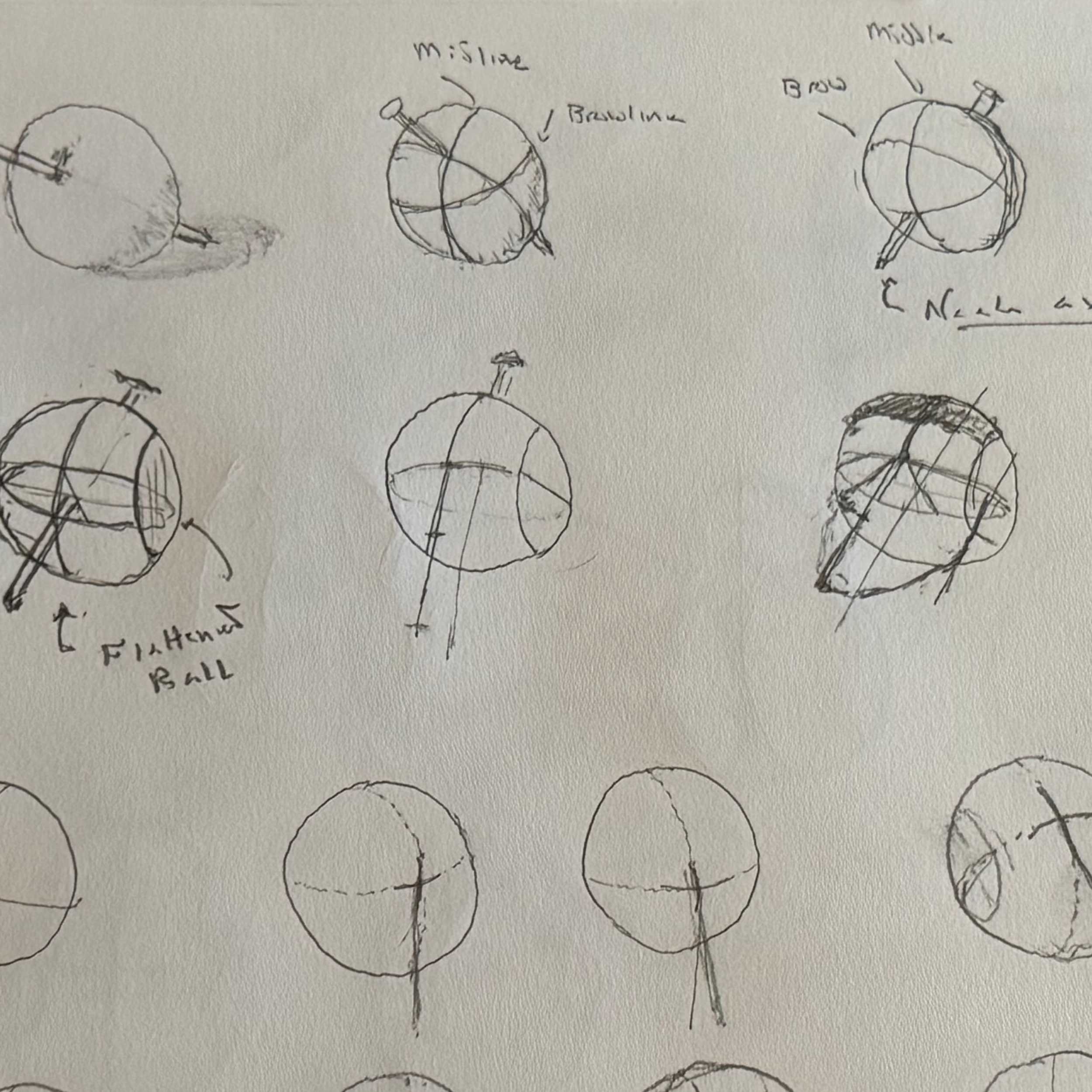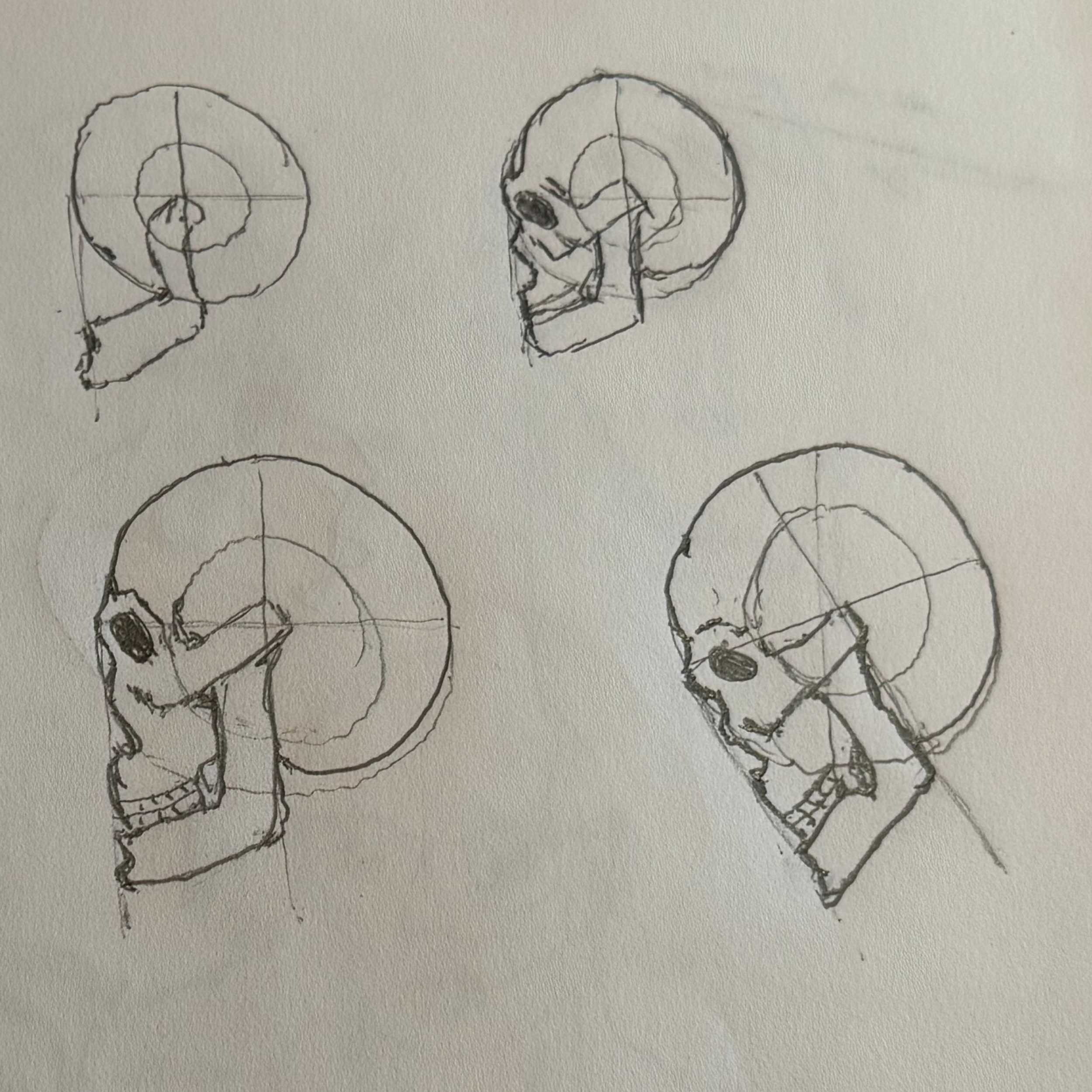 The skull is the foundation for the face, and is especially important for locating the line of the jaw and the cheekbones. Here, I moved on from basic (very basic) facial construction to a more defined architecture of the skull to get a better sense of the relations between the various features of the face.