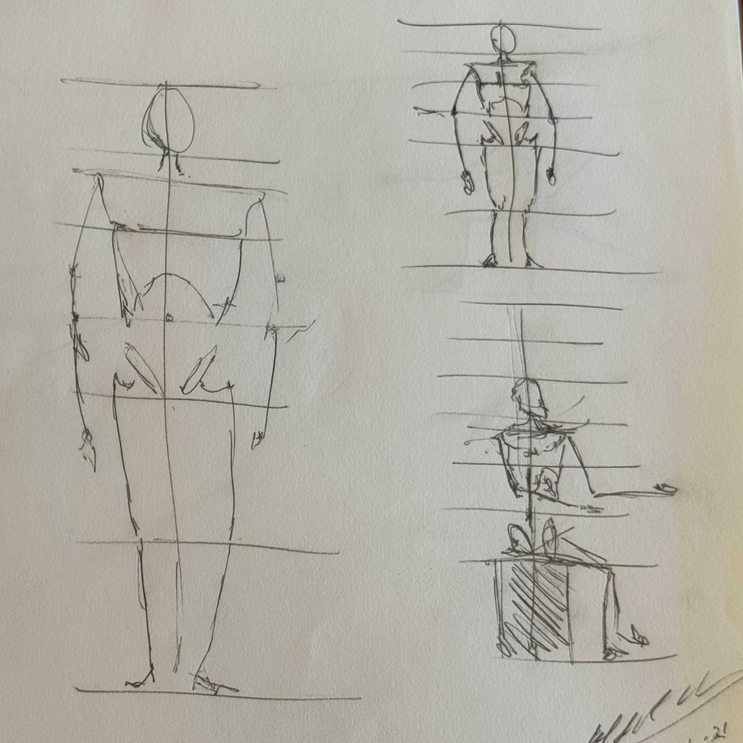 Today, I decided to step out into another realm and work with lines of flesh instead of solely upon proportions using the skeleton of a mannikin-based body. These are the three-view diagrams of men and women, working with and incorporating the lessons of proportion from my previous exercises.