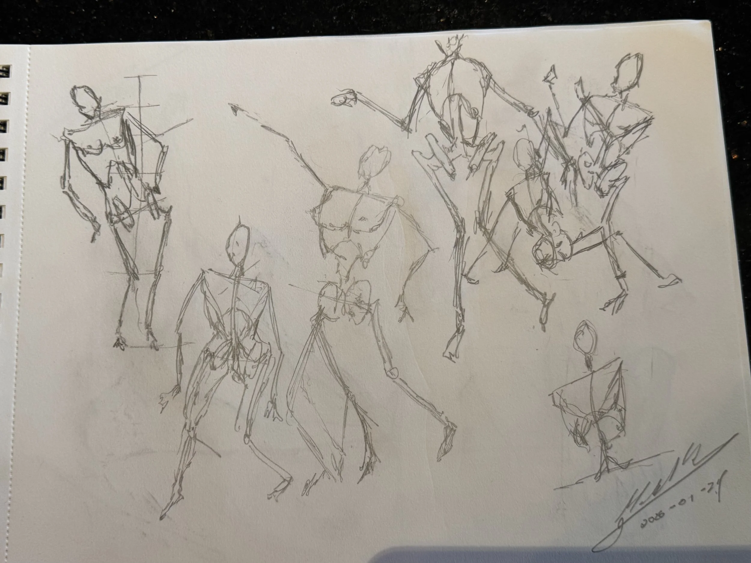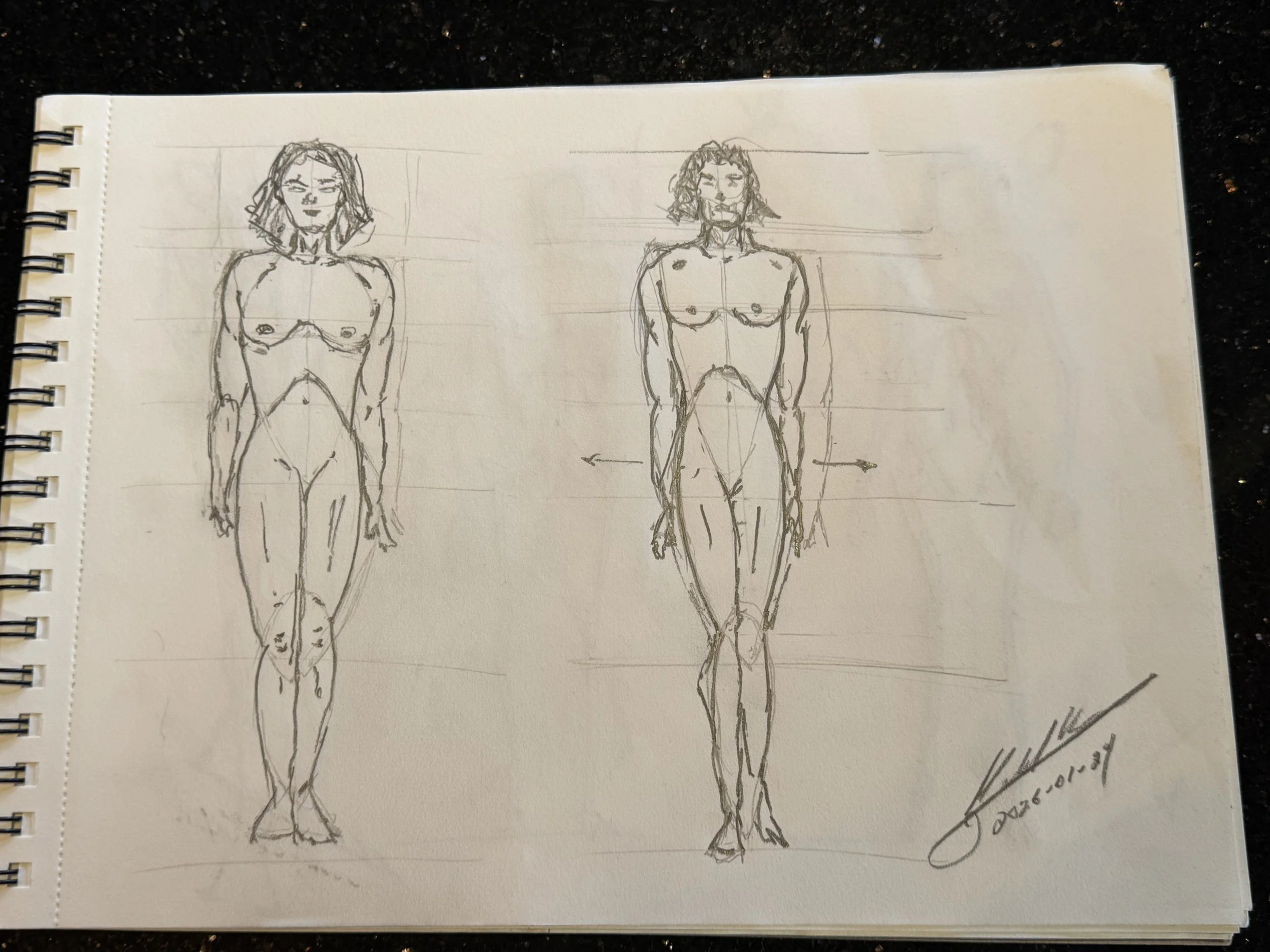 After working with the male proportions initially, I found it incredibly challenging to shift gears and properly lay out female proportions. The large number of sketches represent my level of frustration with not quite being able to simply “shift gears” and embrace a new set of proportions.